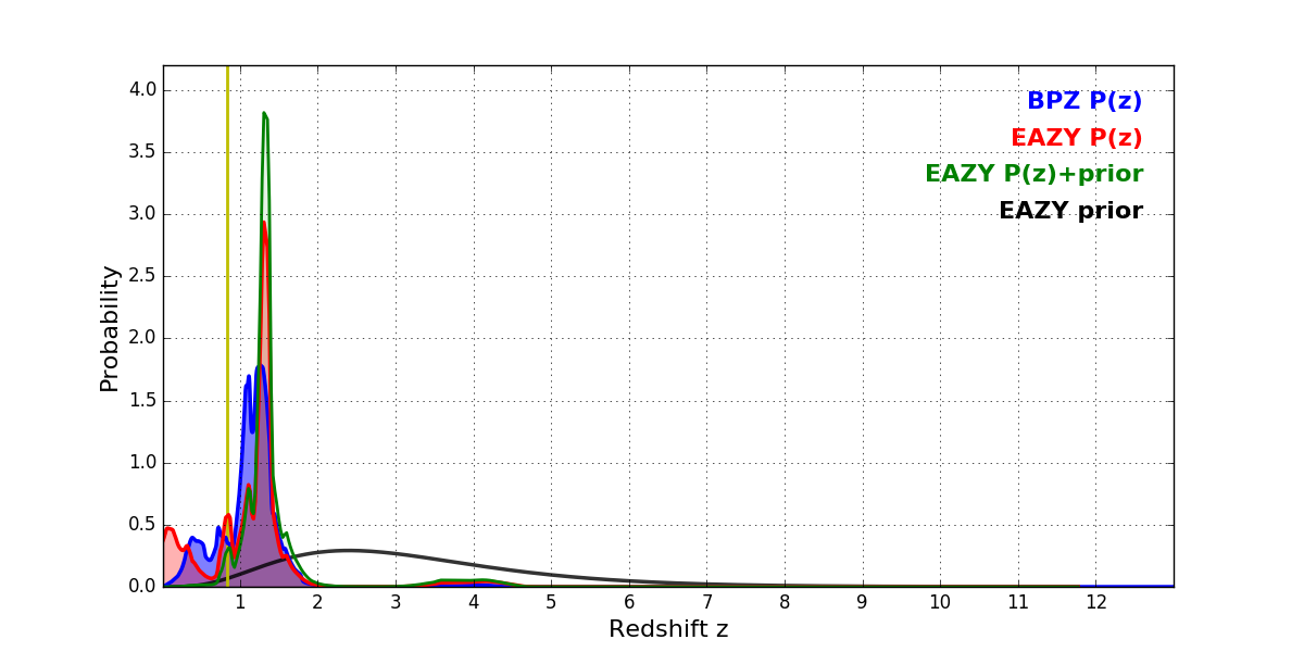 In P(z) plots: Yellow lines mark the cluster redshift z = 0.833,