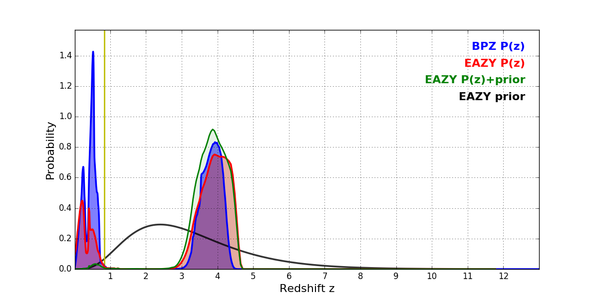 In P(z) plots: Yellow lines mark the cluster redshift z = 0.833,