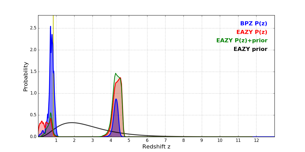 In P(z) plots: Yellow lines mark the cluster redshift z = 0.833,
