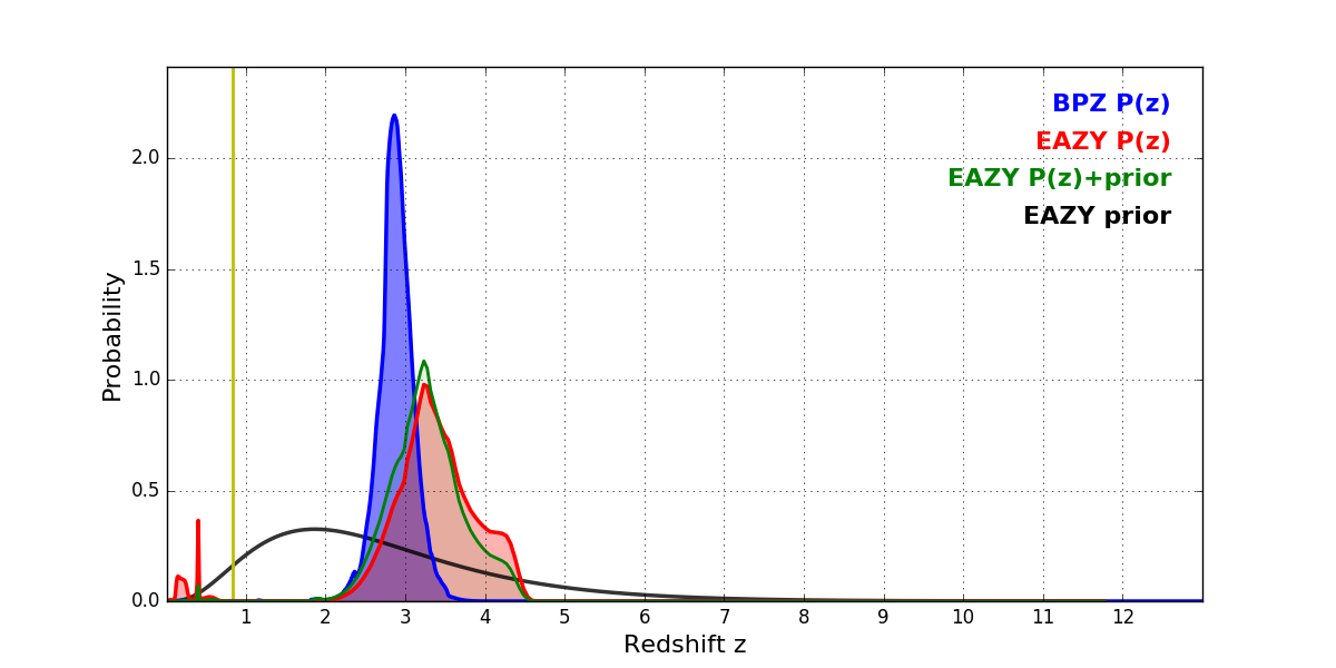 In P(z) plots: Yellow lines mark the cluster redshift z = 0.833,