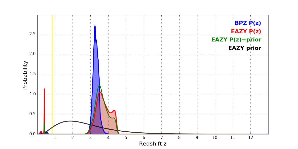 In P(z) plots: Yellow lines mark the cluster redshift z = 0.833,