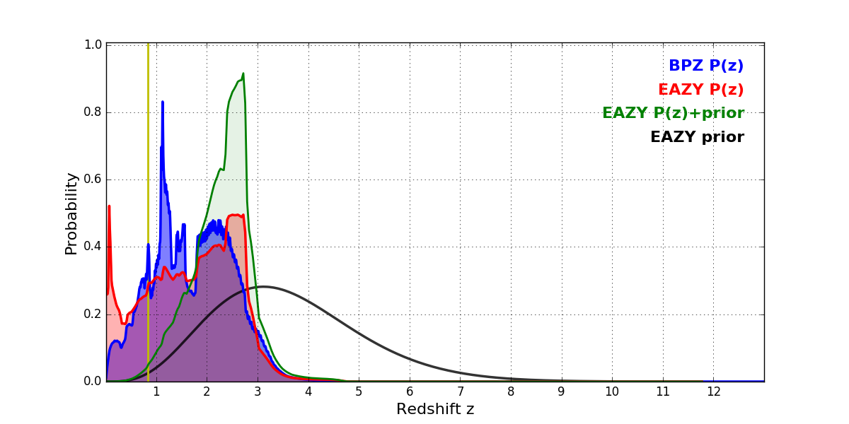 In P(z) plots: Yellow lines mark the cluster redshift z = 0.833,