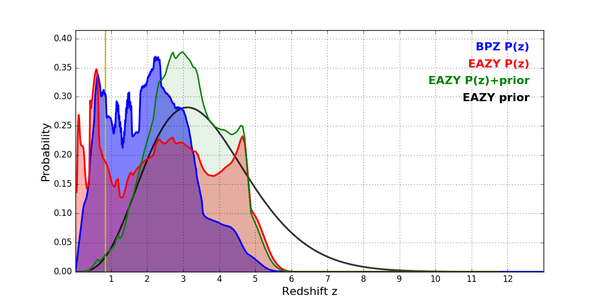 In P(z) plots: Yellow lines mark the cluster redshift z = 0.833,