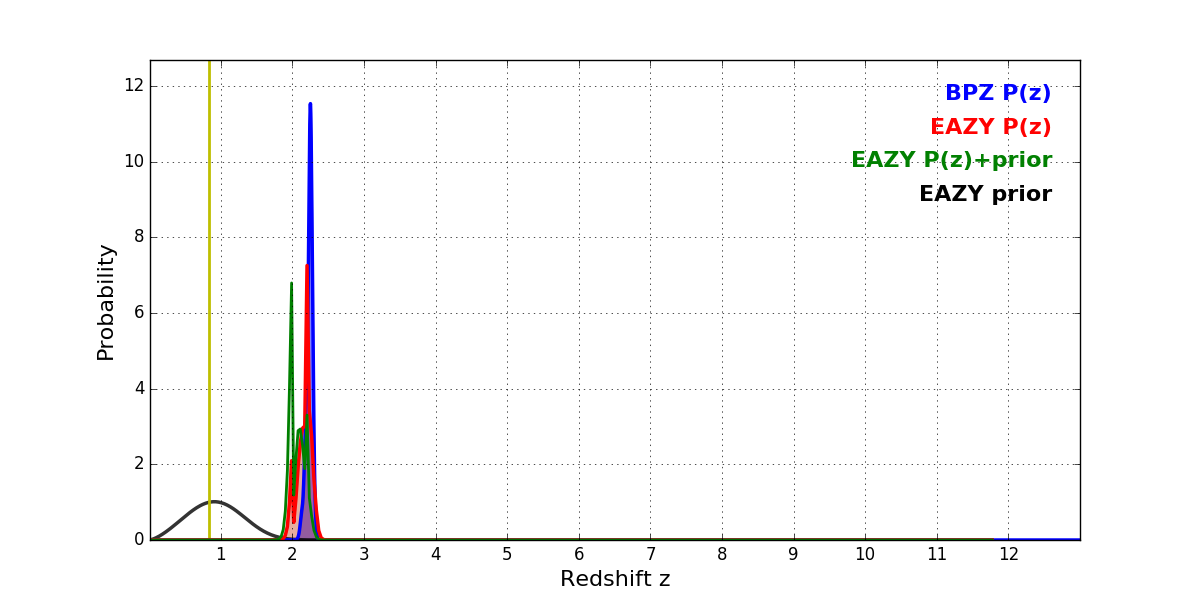 In P(z) plots: Yellow lines mark the cluster redshift z = 0.833,