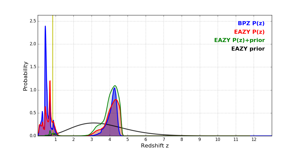 In P(z) plots: Yellow lines mark the cluster redshift z = 0.833,