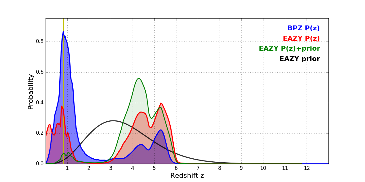 In P(z) plots: Yellow lines mark the cluster redshift z = 0.833,