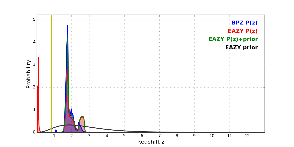 In P(z) plots: Yellow lines mark the cluster redshift z = 0.833,