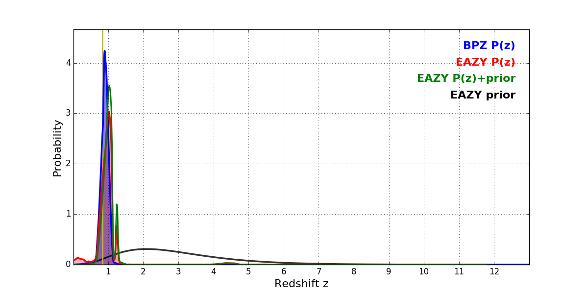 In P(z) plots: Yellow lines mark the cluster redshift z = 0.833,