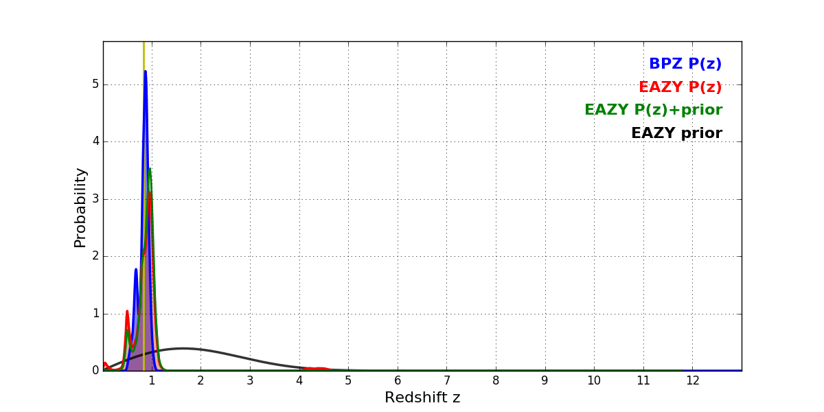 In P(z) plots: Yellow lines mark the cluster redshift z = 0.833,