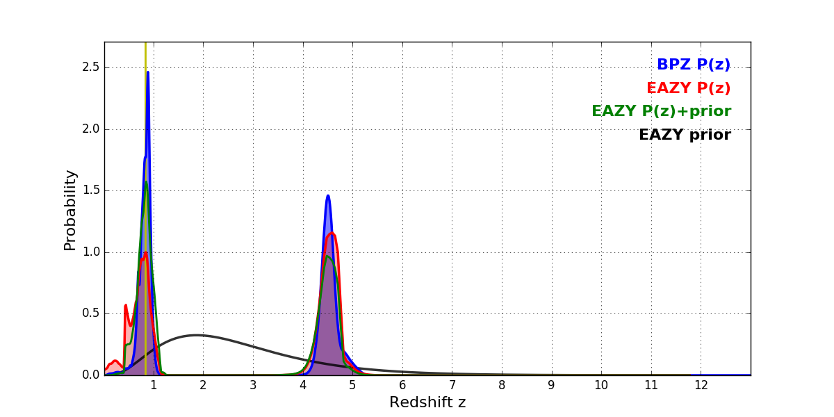 In P(z) plots: Yellow lines mark the cluster redshift z = 0.833,