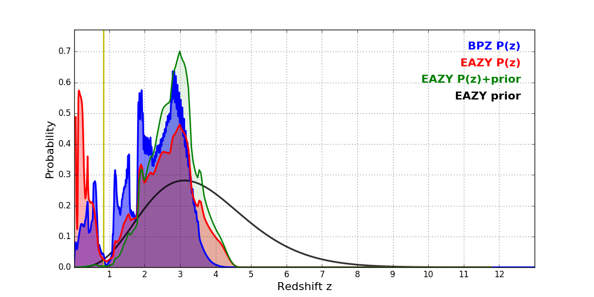 In P(z) plots: Yellow lines mark the cluster redshift z = 0.833,