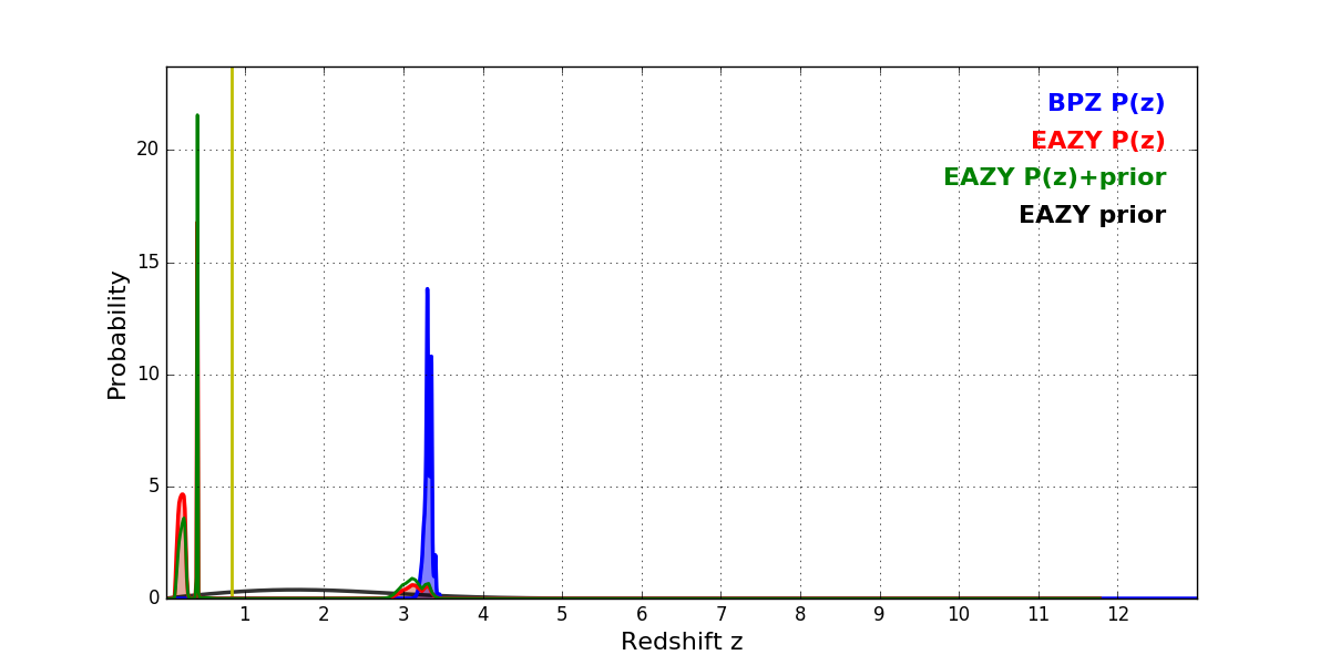 In P(z) plots: Yellow lines mark the cluster redshift z = 0.833,
