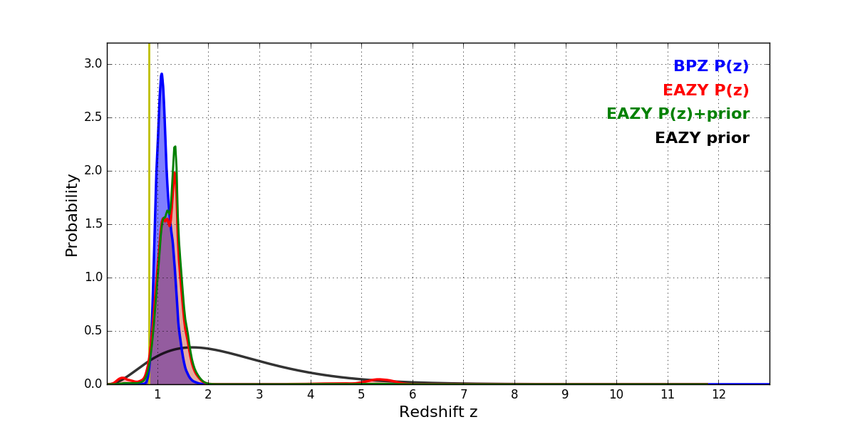 In P(z) plots: Yellow lines mark the cluster redshift z = 0.833,