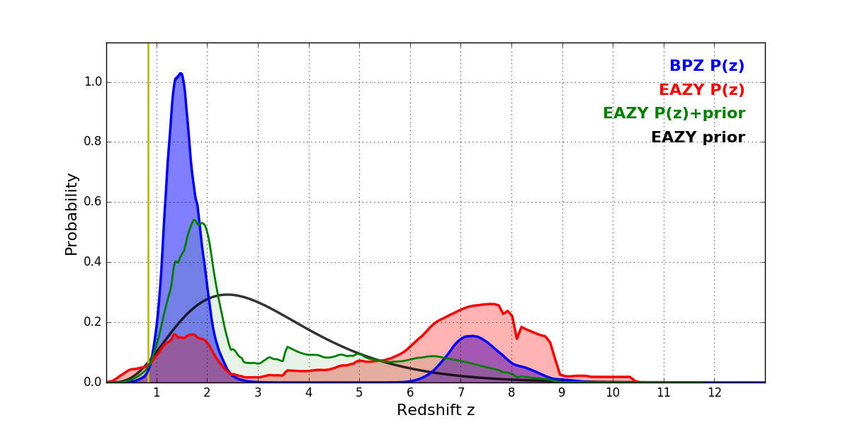 In P(z) plots: Yellow lines mark the cluster redshift z = 0.833,