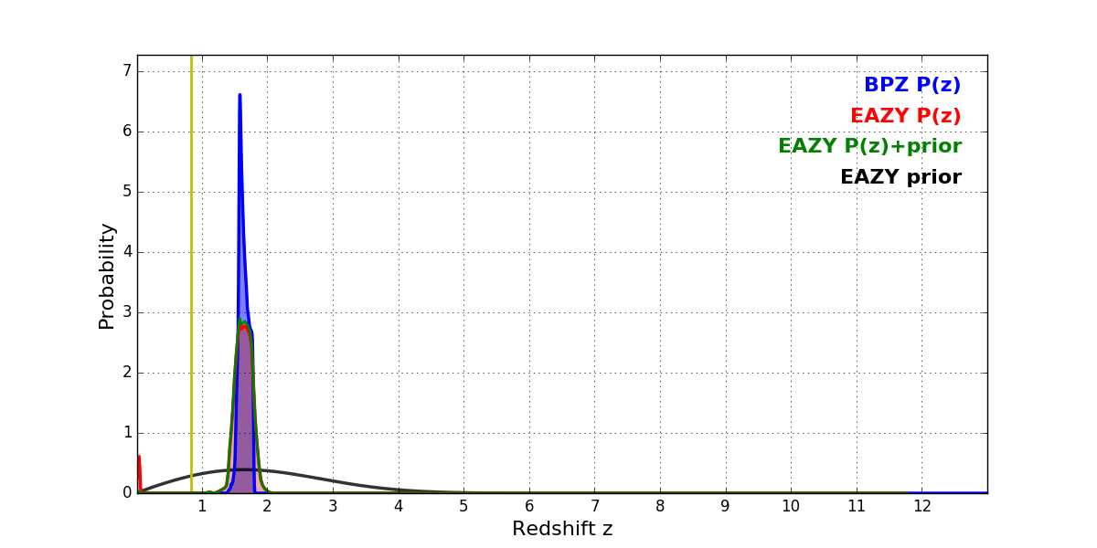 In P(z) plots: Yellow lines mark the cluster redshift z = 0.833,