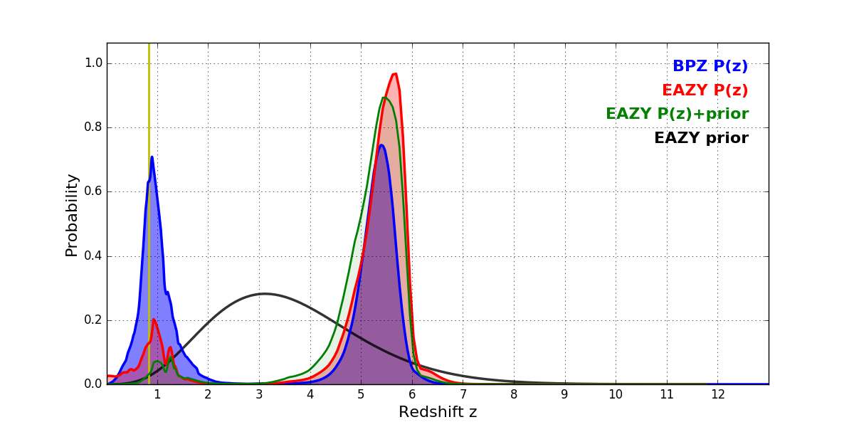In P(z) plots: Yellow lines mark the cluster redshift z = 0.833,
