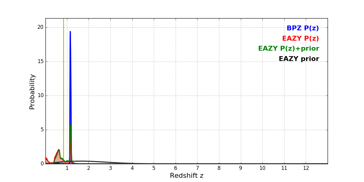 In P(z) plots: Yellow lines mark the cluster redshift z = 0.833,