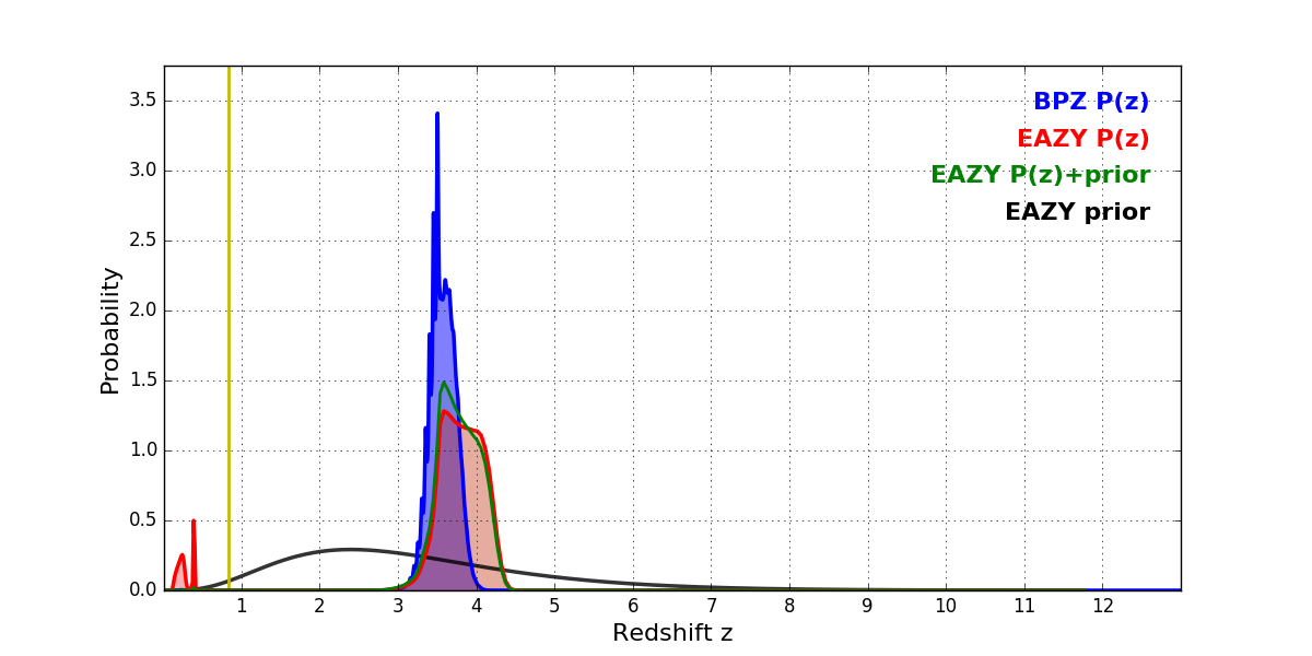 In P(z) plots: Yellow lines mark the cluster redshift z = 0.833,