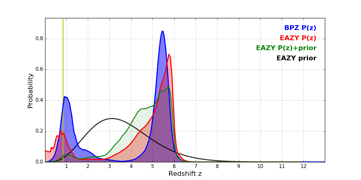In P(z) plots: Yellow lines mark the cluster redshift z = 0.833,