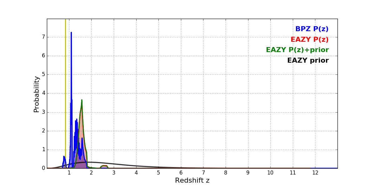 In P(z) plots: Yellow lines mark the cluster redshift z = 0.833,