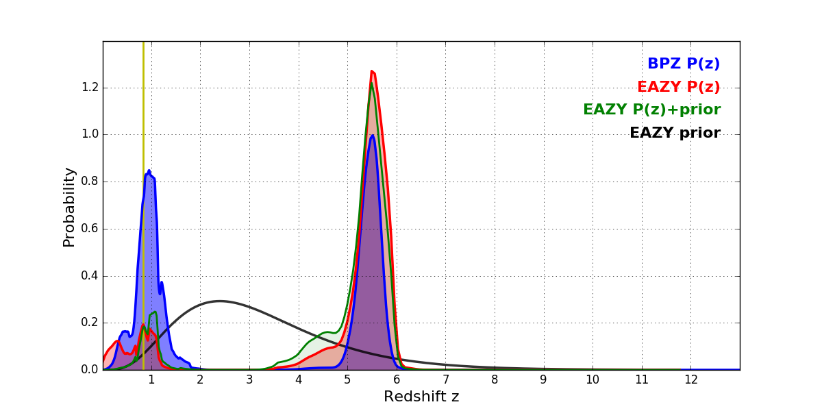 In P(z) plots: Yellow lines mark the cluster redshift z = 0.833,