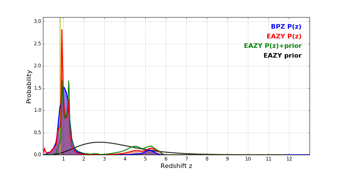 In P(z) plots: Yellow lines mark the cluster redshift z = 0.833,