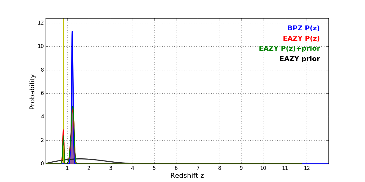 In P(z) plots: Yellow lines mark the cluster redshift z = 0.833,