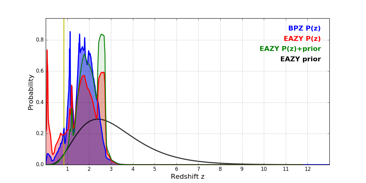 In P(z) plots: Yellow lines mark the cluster redshift z = 0.833,