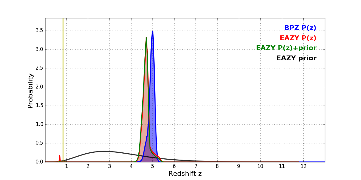 In P(z) plots: Yellow lines mark the cluster redshift z = 0.833,