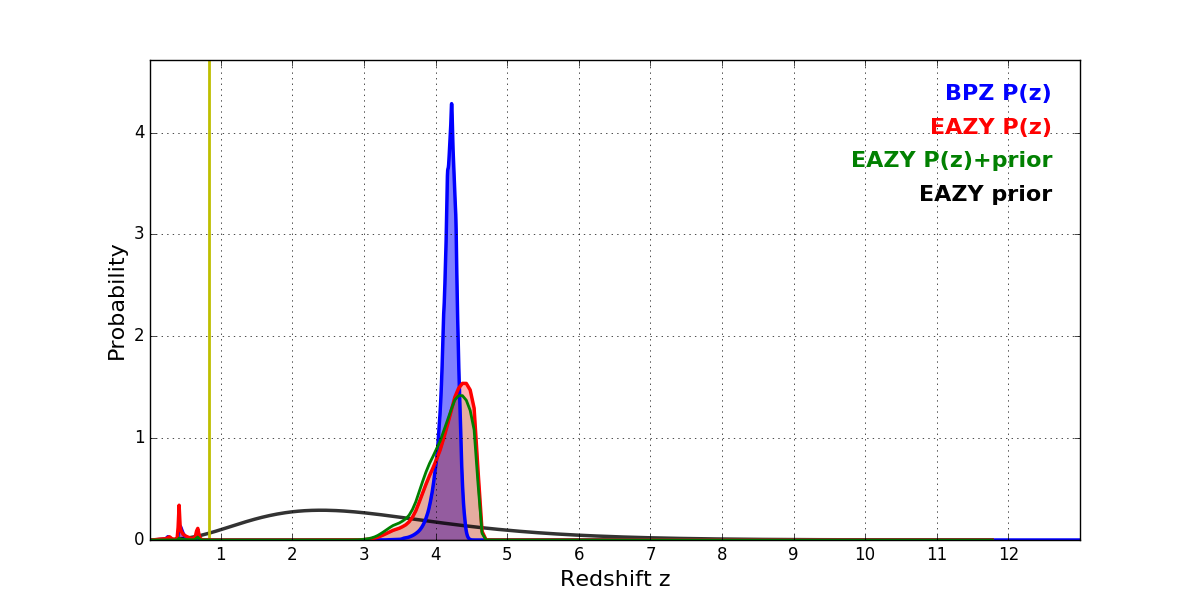 In P(z) plots: Yellow lines mark the cluster redshift z = 0.833,