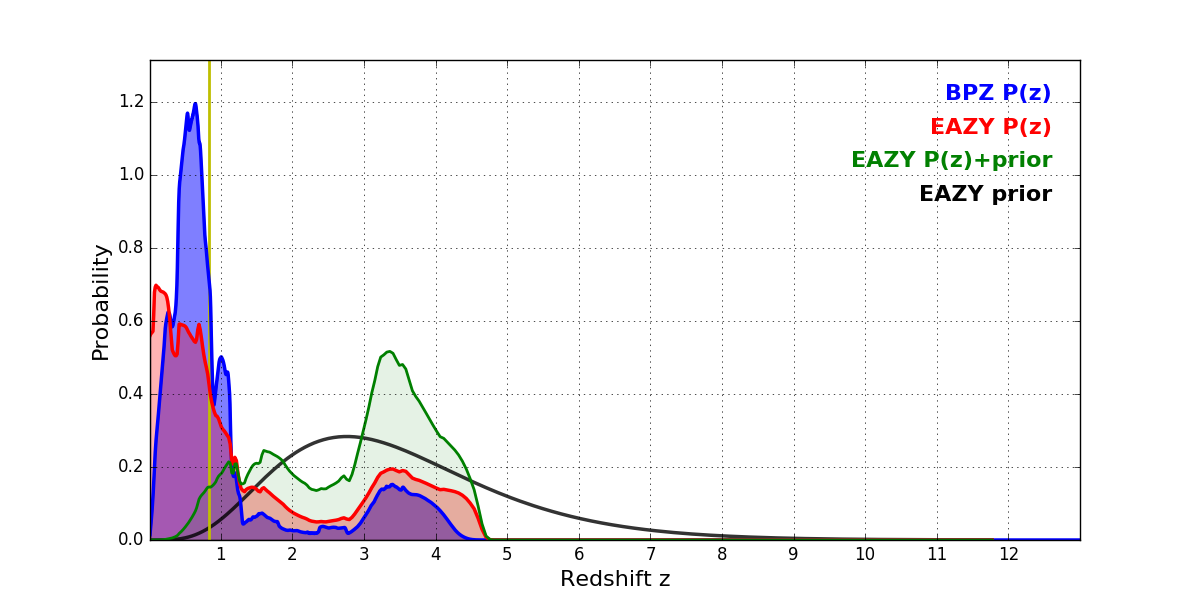 In P(z) plots: Yellow lines mark the cluster redshift z = 0.833,