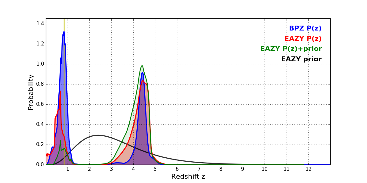 In P(z) plots: Yellow lines mark the cluster redshift z = 0.833,