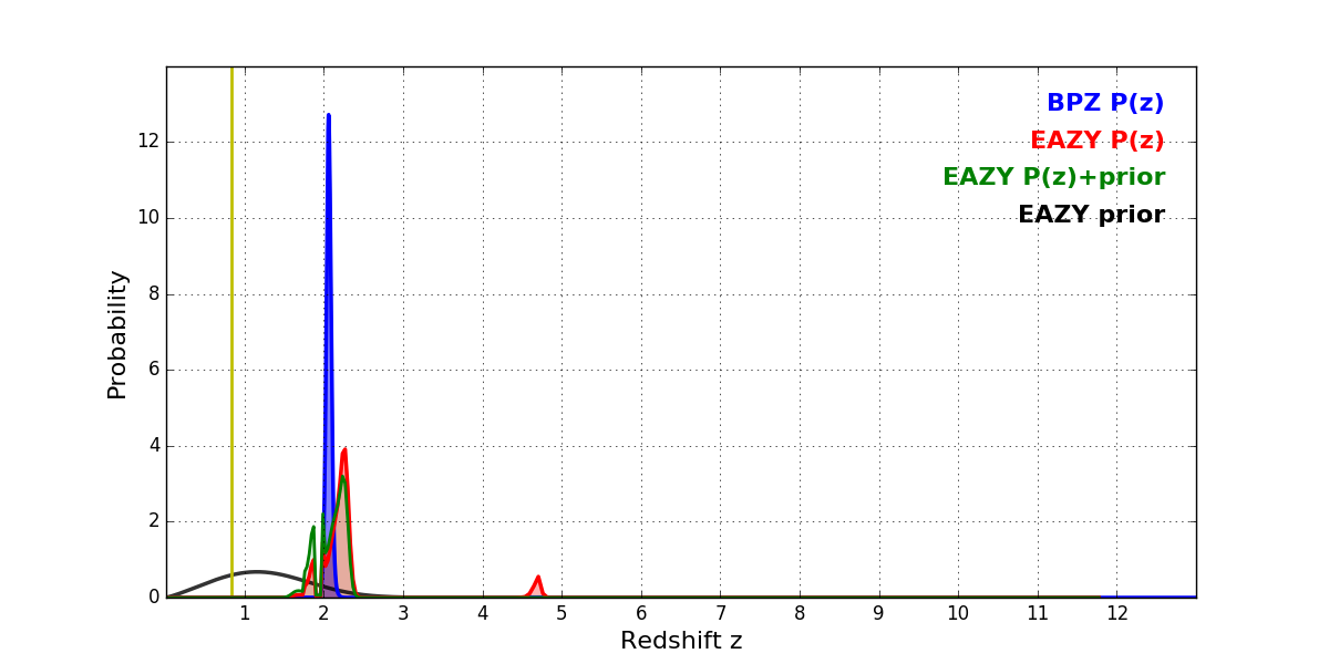 In P(z) plots: Yellow lines mark the cluster redshift z = 0.833,