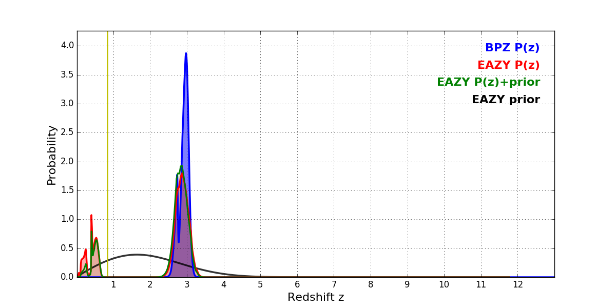 In P(z) plots: Yellow lines mark the cluster redshift z = 0.833,