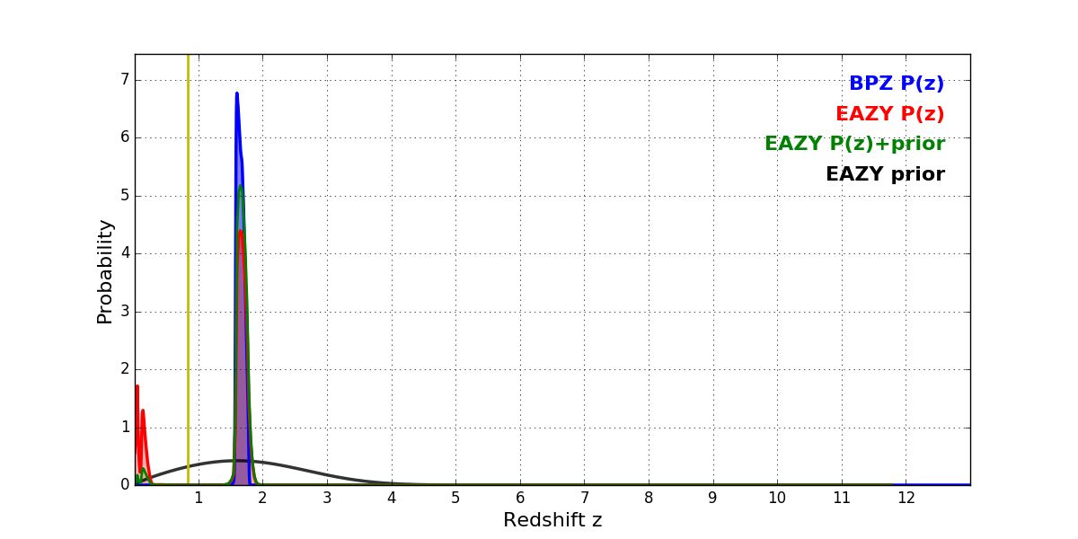 In P(z) plots: Yellow lines mark the cluster redshift z = 0.833,
