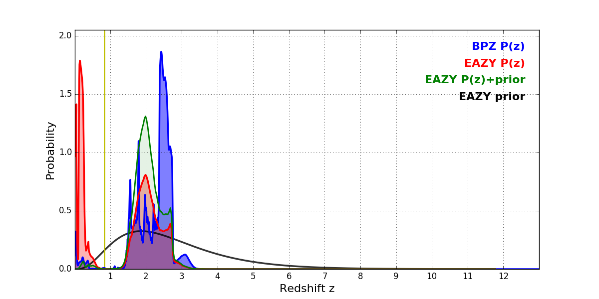 In P(z) plots: Yellow lines mark the cluster redshift z = 0.833,