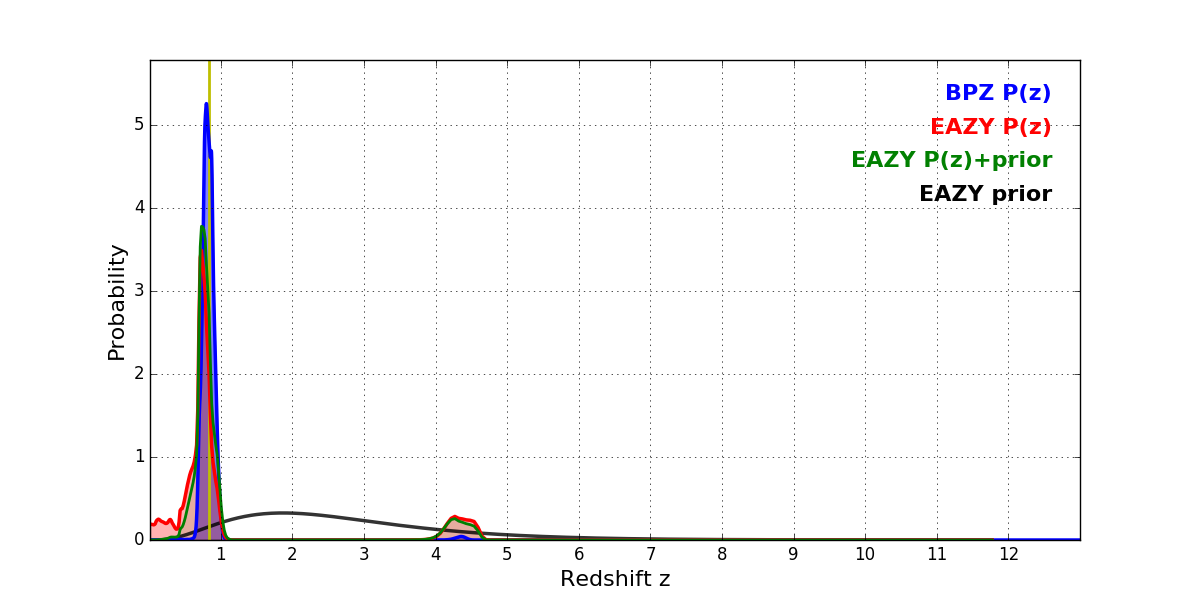 In P(z) plots: Yellow lines mark the cluster redshift z = 0.833,