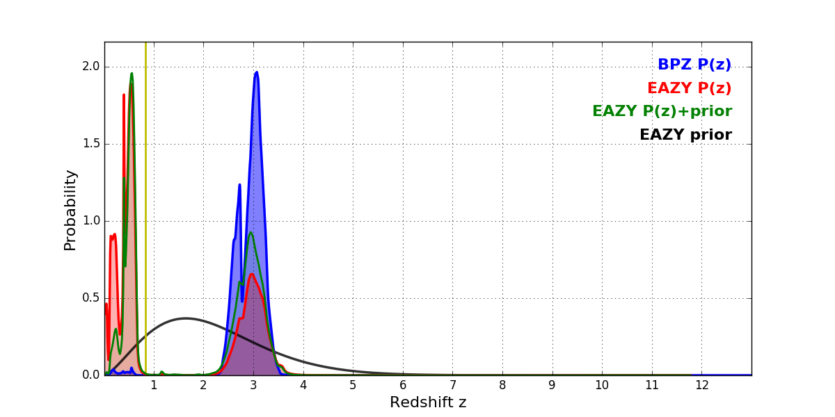 In P(z) plots: Yellow lines mark the cluster redshift z = 0.833,