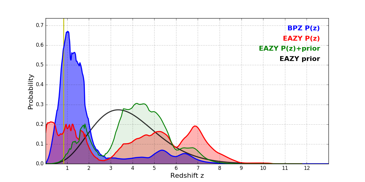 In P(z) plots: Yellow lines mark the cluster redshift z = 0.833,
