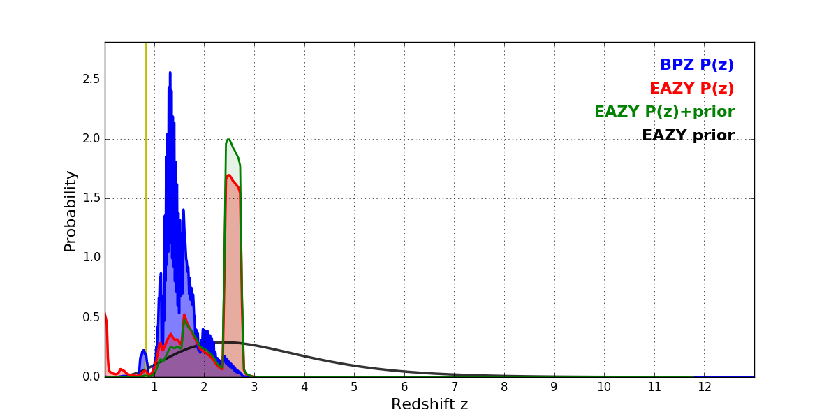 In P(z) plots: Yellow lines mark the cluster redshift z = 0.833,