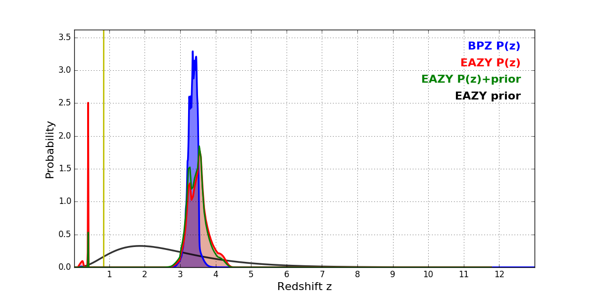 In P(z) plots: Yellow lines mark the cluster redshift z = 0.833,