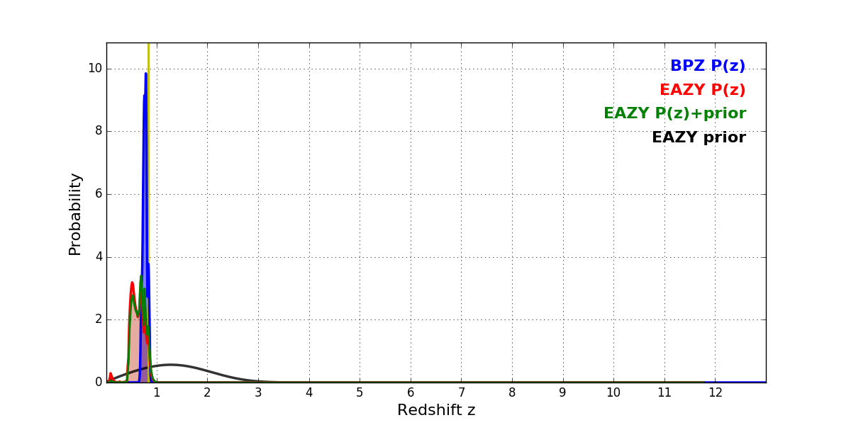 In P(z) plots: Yellow lines mark the cluster redshift z = 0.833,