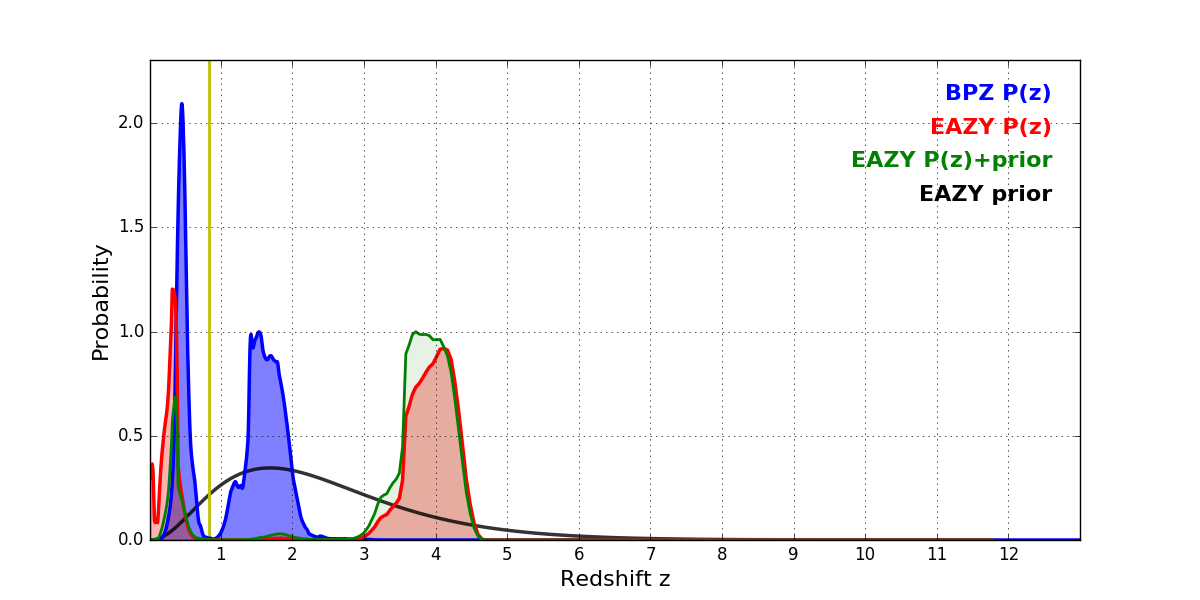 In P(z) plots: Yellow lines mark the cluster redshift z = 0.833,