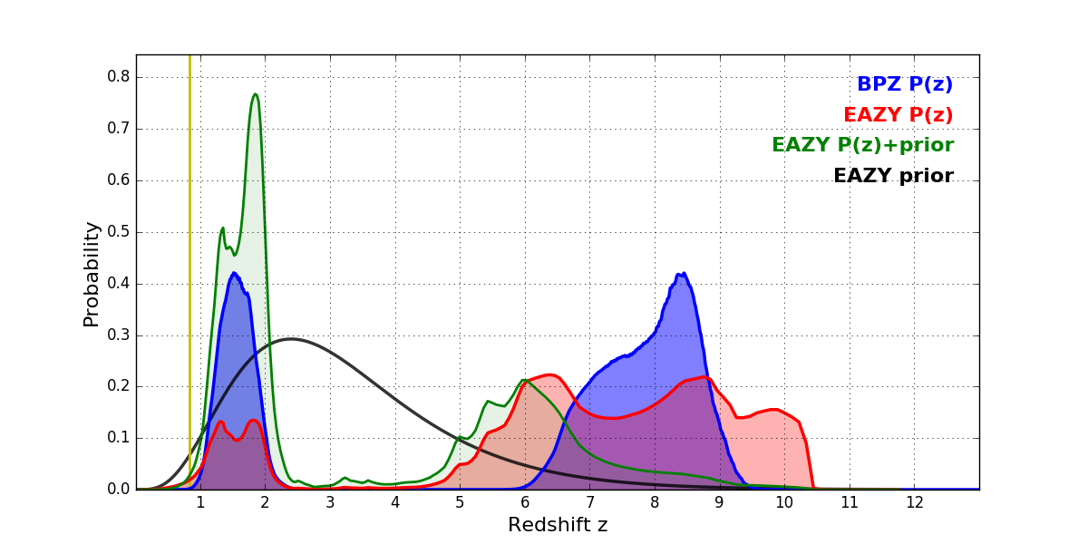 In P(z) plots: Yellow lines mark the cluster redshift z = 0.833,