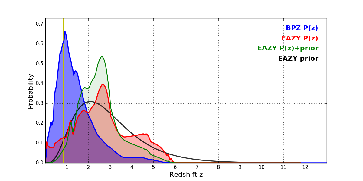 In P(z) plots: Yellow lines mark the cluster redshift z = 0.833,