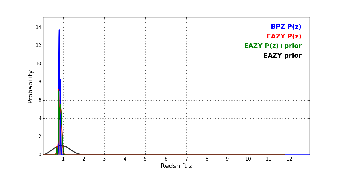 In P(z) plots: Yellow lines mark the cluster redshift z = 0.833,