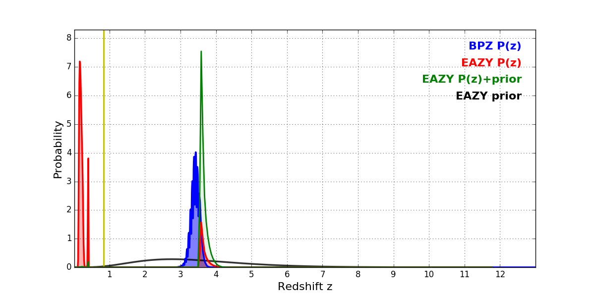 In P(z) plots: Yellow lines mark the cluster redshift z = 0.833,