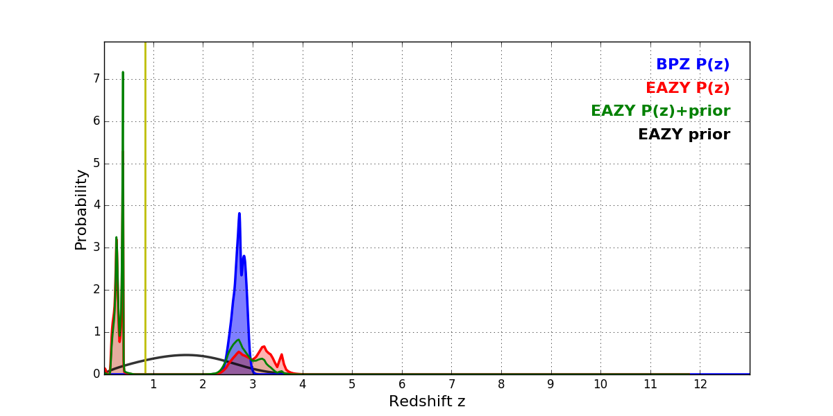 In P(z) plots: Yellow lines mark the cluster redshift z = 0.833,