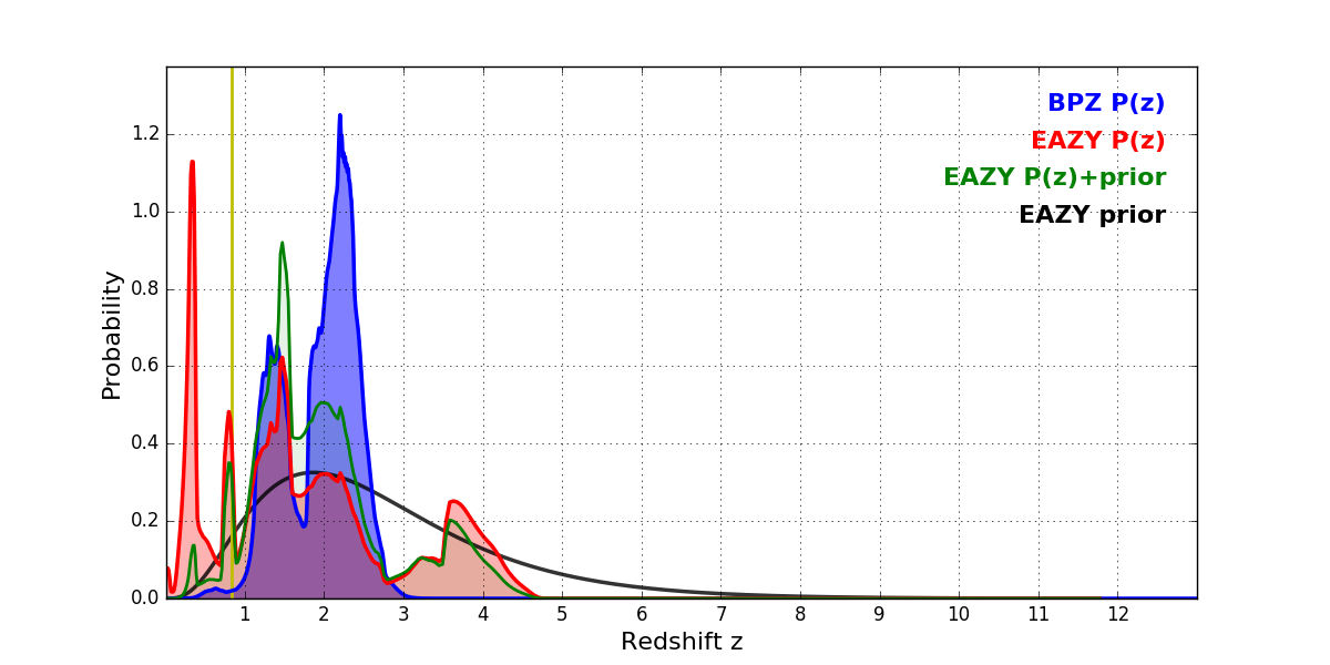 In P(z) plots: Yellow lines mark the cluster redshift z = 0.833,