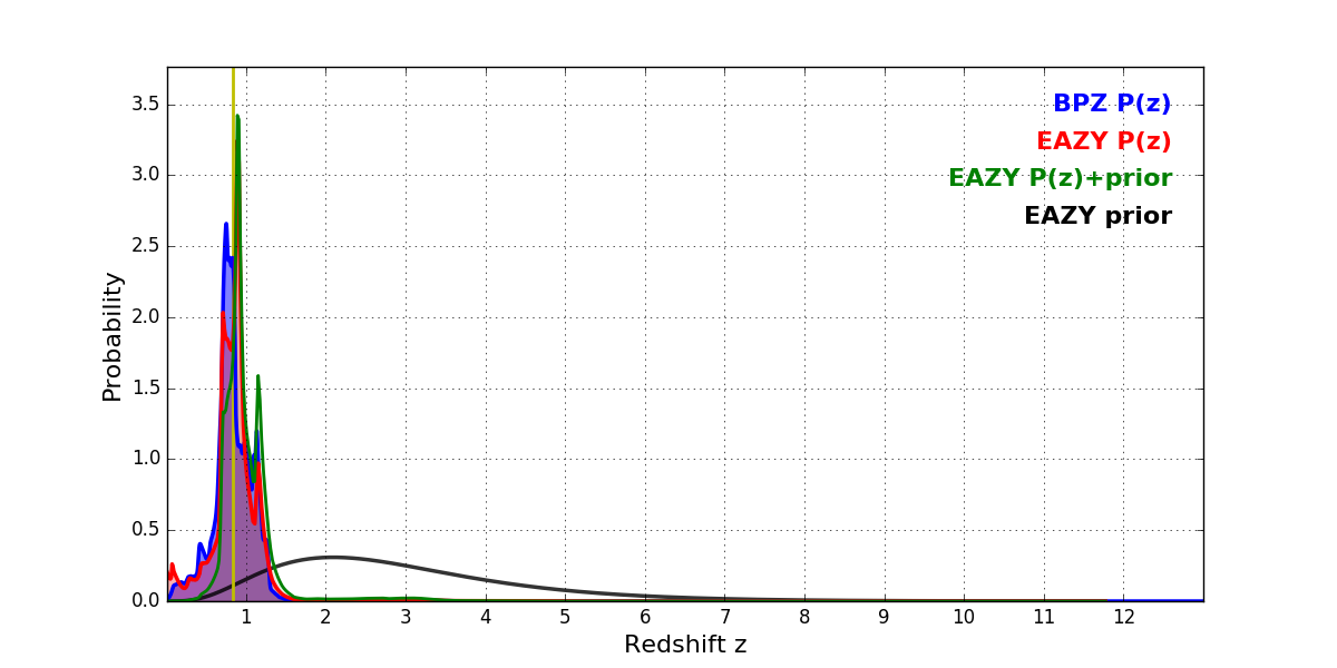 In P(z) plots: Yellow lines mark the cluster redshift z = 0.833,